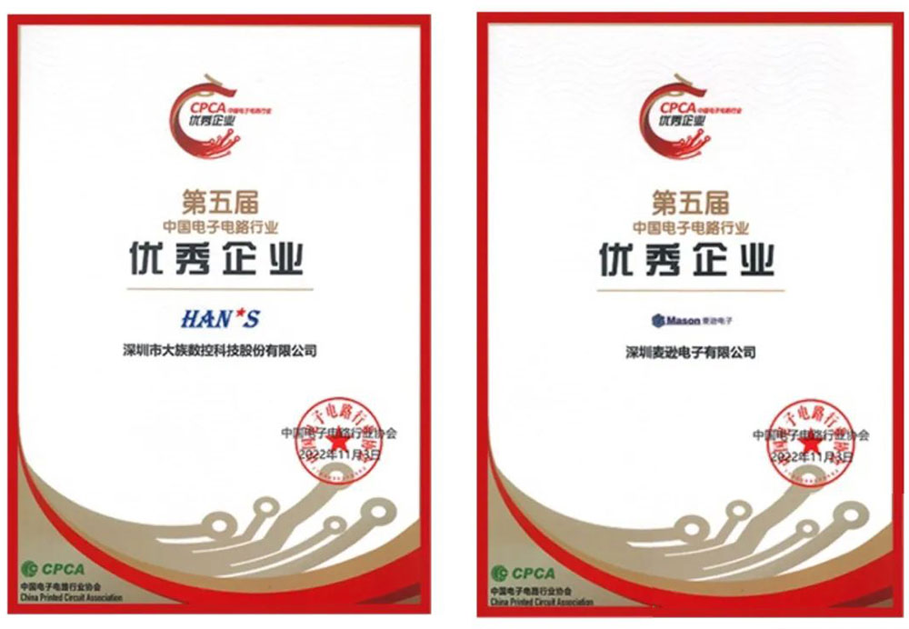 此次参与评选的都是实力雄厚的企业,历经层层筛选,大族数控及旗下麦逊电子双双脱颖而出,获得第五届中国电子电路行业优秀企业,这是对大族数控在PCB专用设备领域取得亮眼业绩给予的肯定,为大族数控“成为世界范围内最受尊敬和信赖的PCB装备服务商”的愿景再添一笔精彩的注脚。